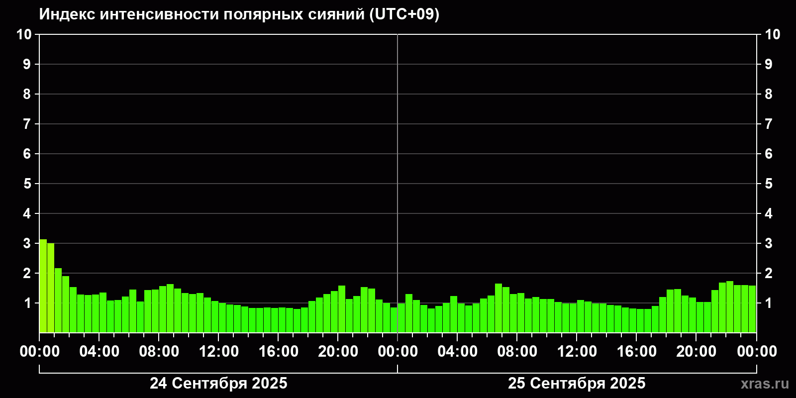 Изменения индекса интенсивности полярных сияний с 2025-09-24 по 2025-09-25 по местному времени