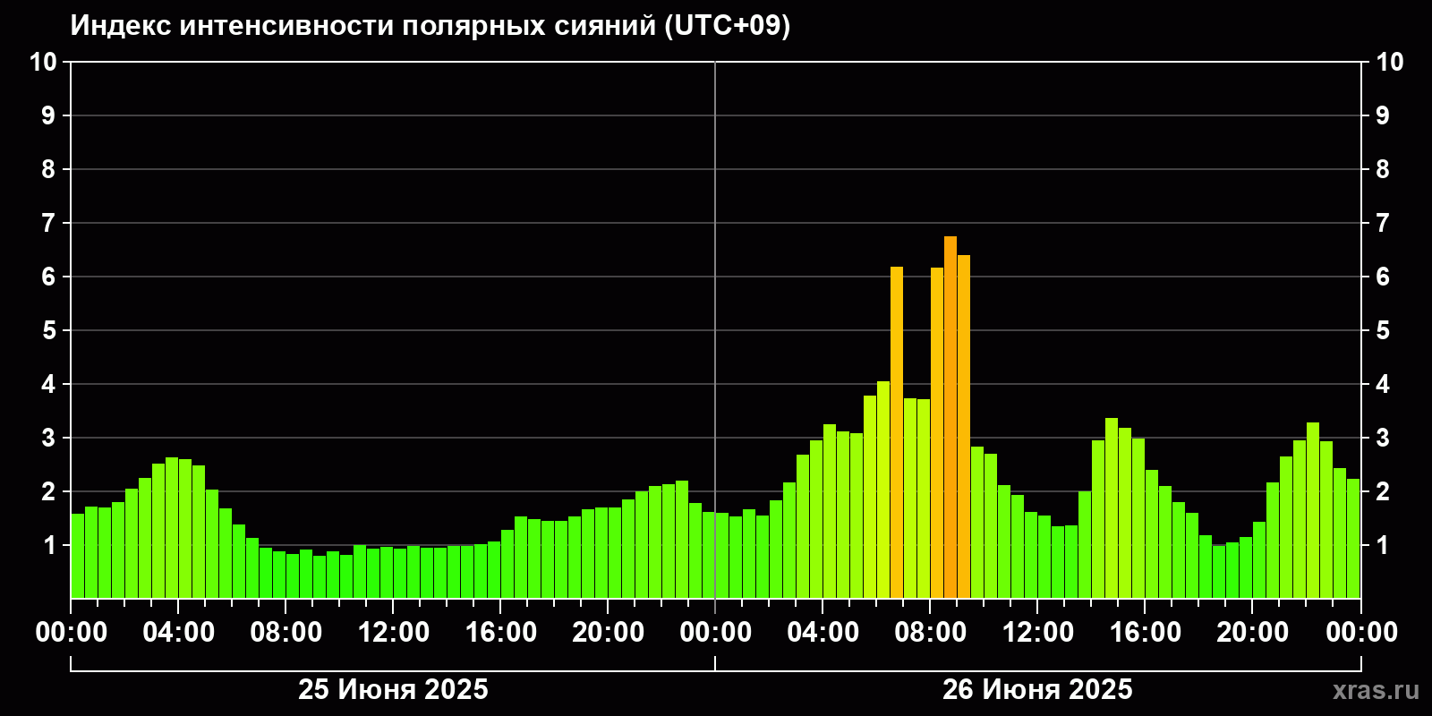 Изменения индекса интенсивности полярных сияний с 2025-06-25 по 2025-06-26 по местному времени