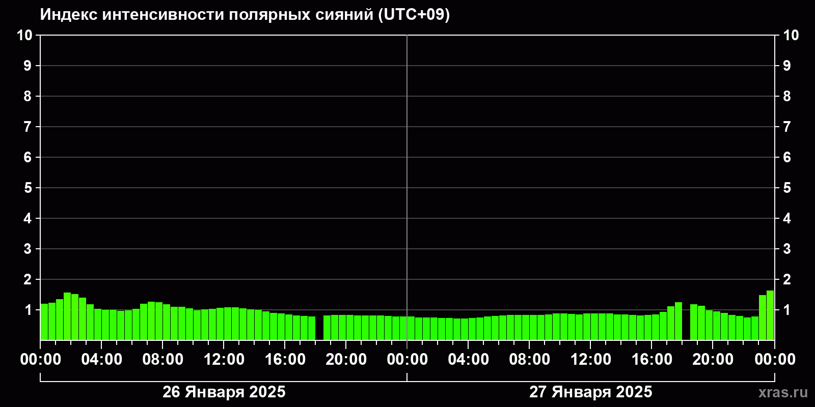 Изменения индекса интенсивности полярных сияний с 2025-01-26 по 2025-01-27 по местному времени