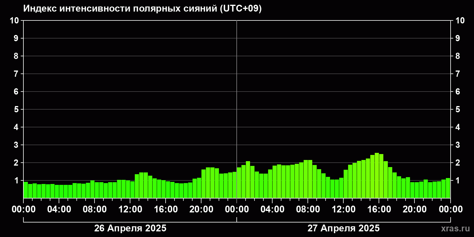 Изменения индекса интенсивности полярных сияний с 2025-04-26 по 2025-04-27 по местному времени