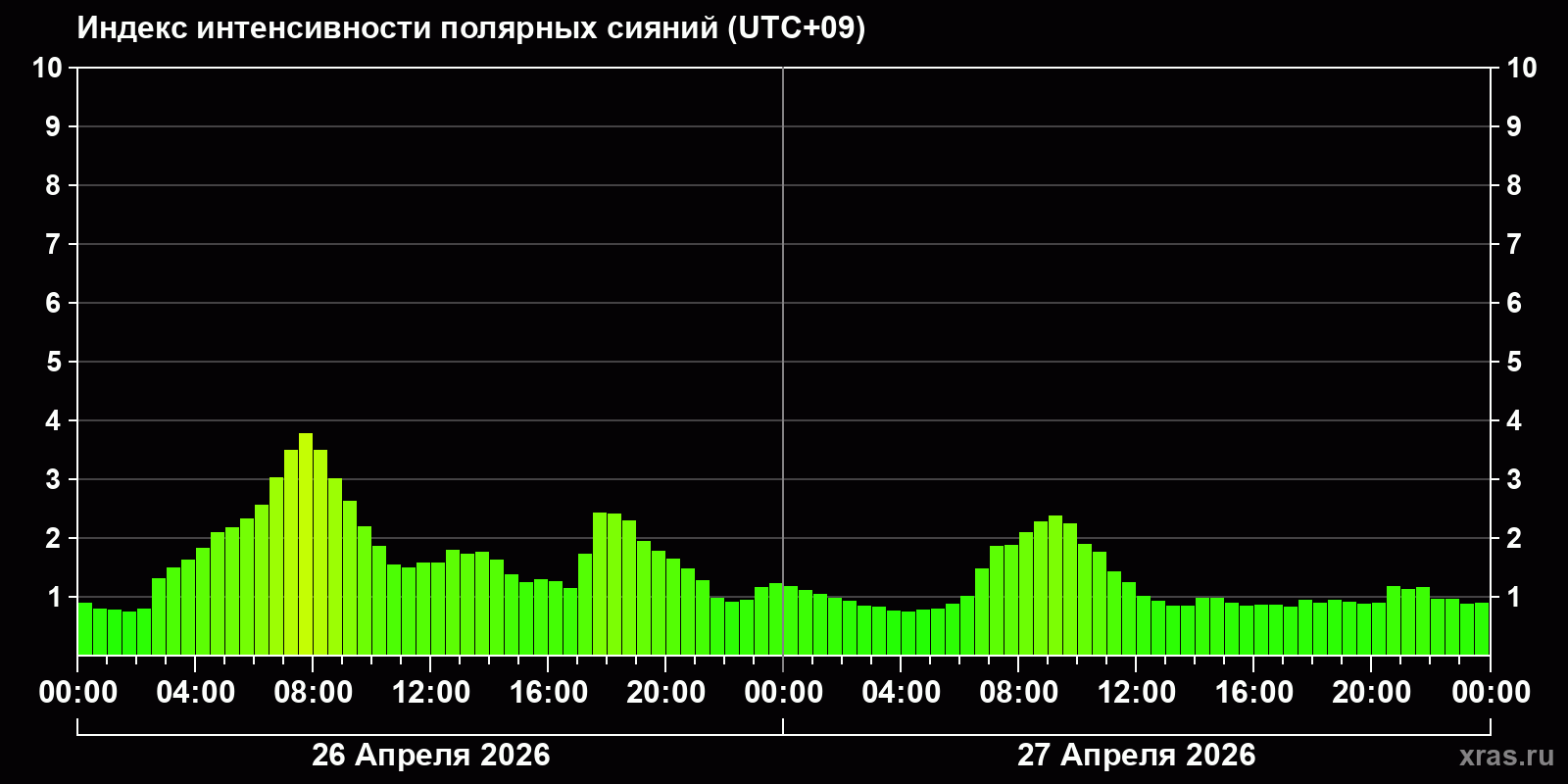 Изменения индекса интенсивности полярных сияний с 2026-04-26 по 2026-04-27 по местному времени