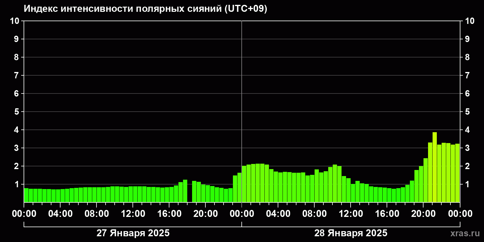 Изменения индекса интенсивности полярных сияний с 2025-01-27 по 2025-01-28 по местному времени