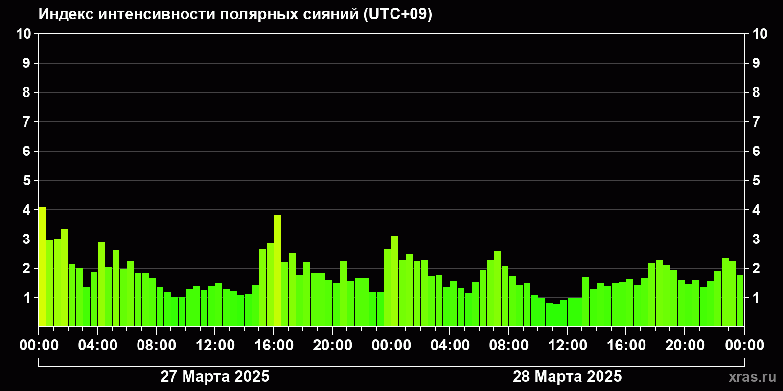 Изменения индекса интенсивности полярных сияний с 2025-03-27 по 2025-03-28 по местному времени