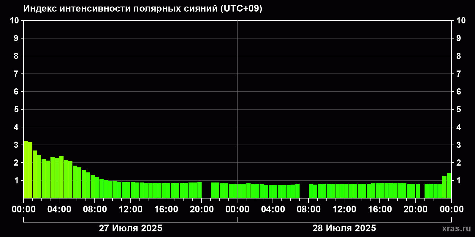 Изменения индекса интенсивности полярных сияний с 2025-07-27 по 2025-07-28 по местному времени