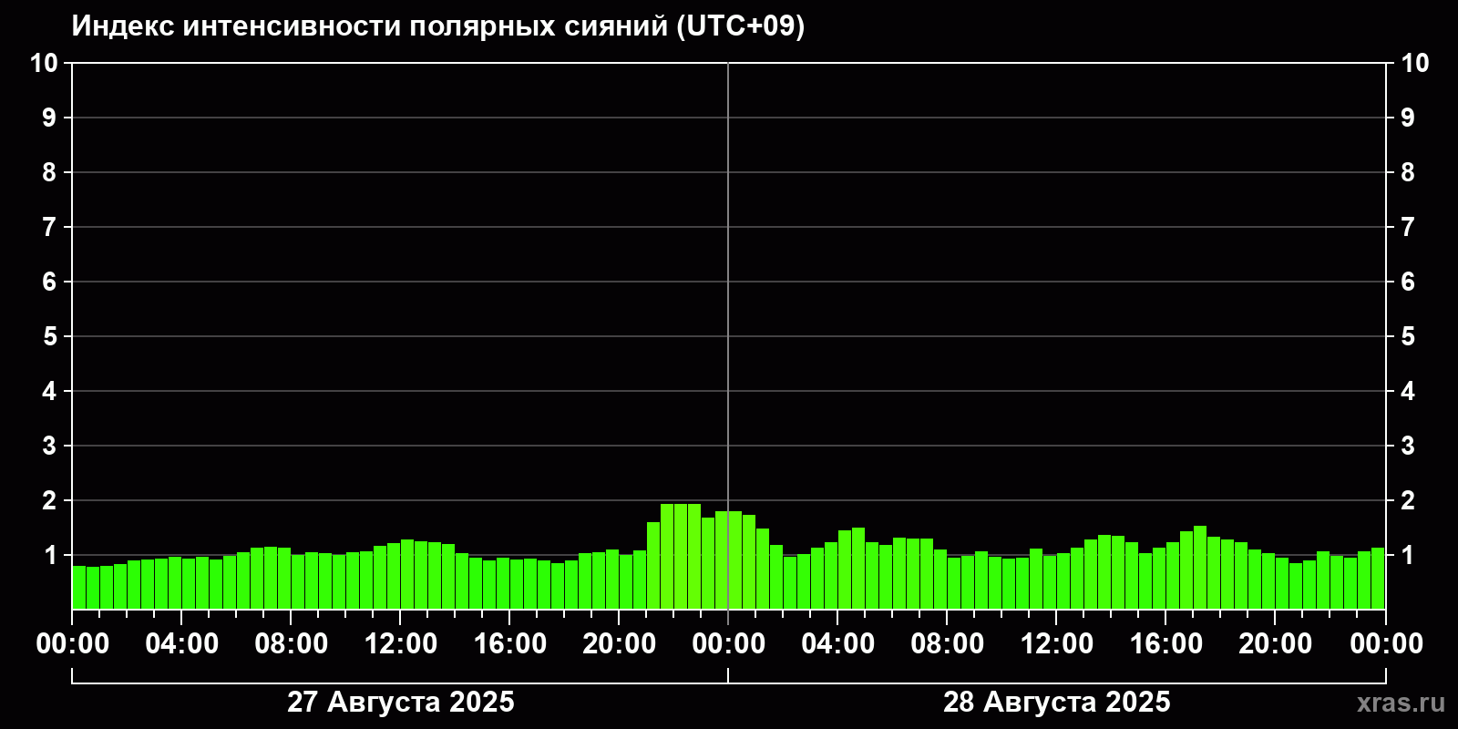 Изменения индекса интенсивности полярных сияний с 2025-08-27 по 2025-08-28 по местному времени