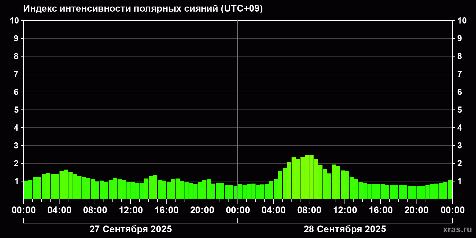 Изменения индекса интенсивности полярных сияний с 2025-09-27 по 2025-09-28 по местному времени