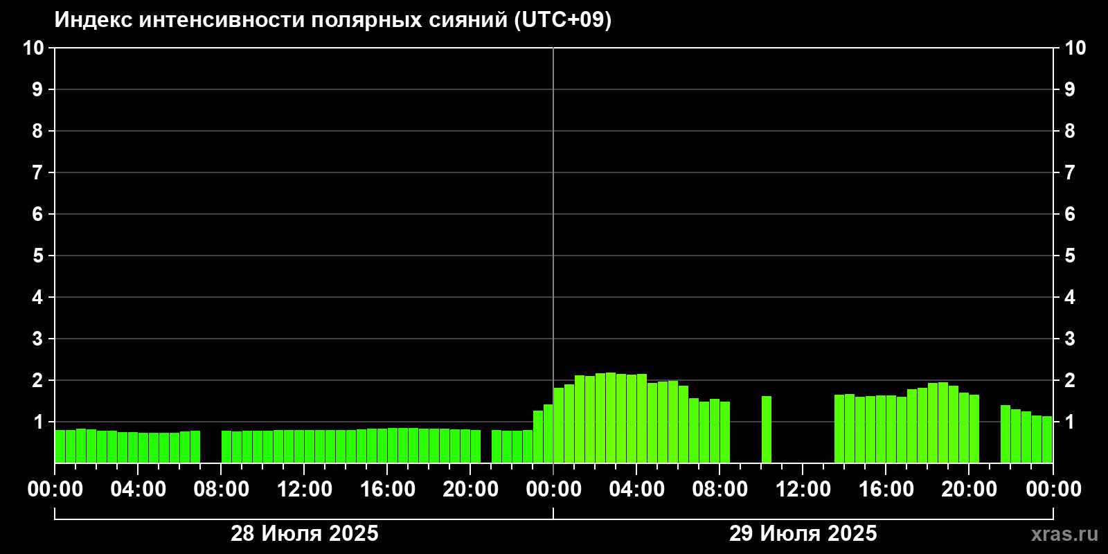 Изменения индекса интенсивности полярных сияний с 2025-07-28 по 2025-07-29 по местному времени