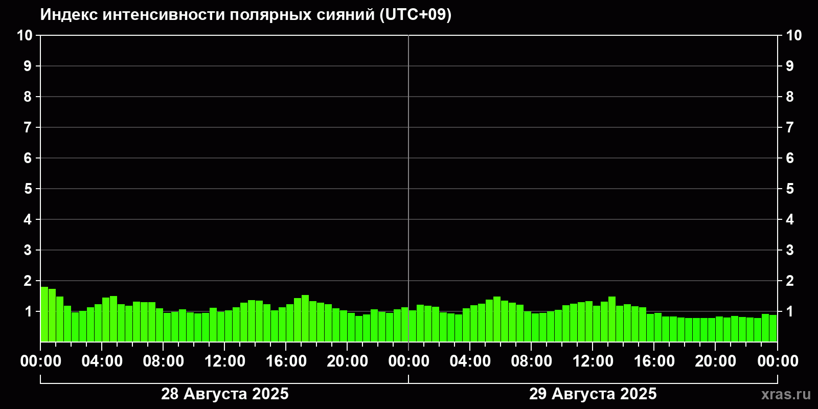 Изменения индекса интенсивности полярных сияний с 2025-08-28 по 2025-08-29 по местному времени