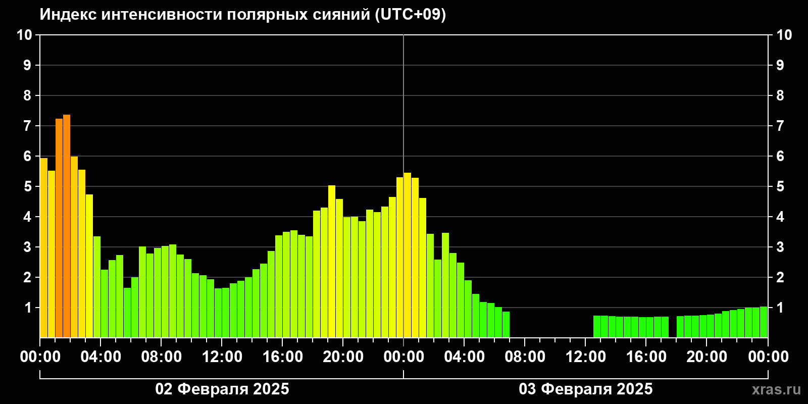 Изменения индекса интенсивности полярных сияний с 2025-02-02 по 2025-02-03 по местному времени
