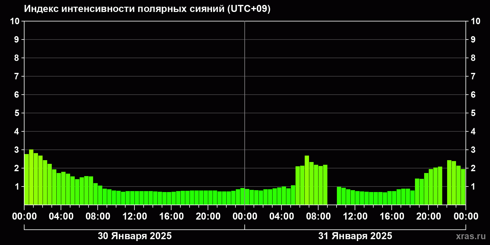 Изменения индекса интенсивности полярных сияний с 2025-01-30 по 2025-01-31 по местному времени