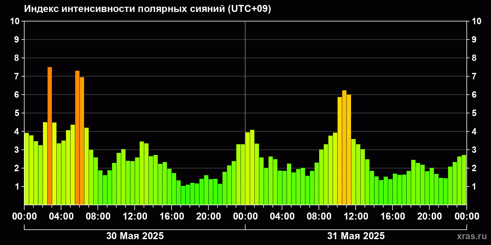 Изменения индекса интенсивности полярных сияний с 2025-05-30 по 2025-05-31 по местному времени