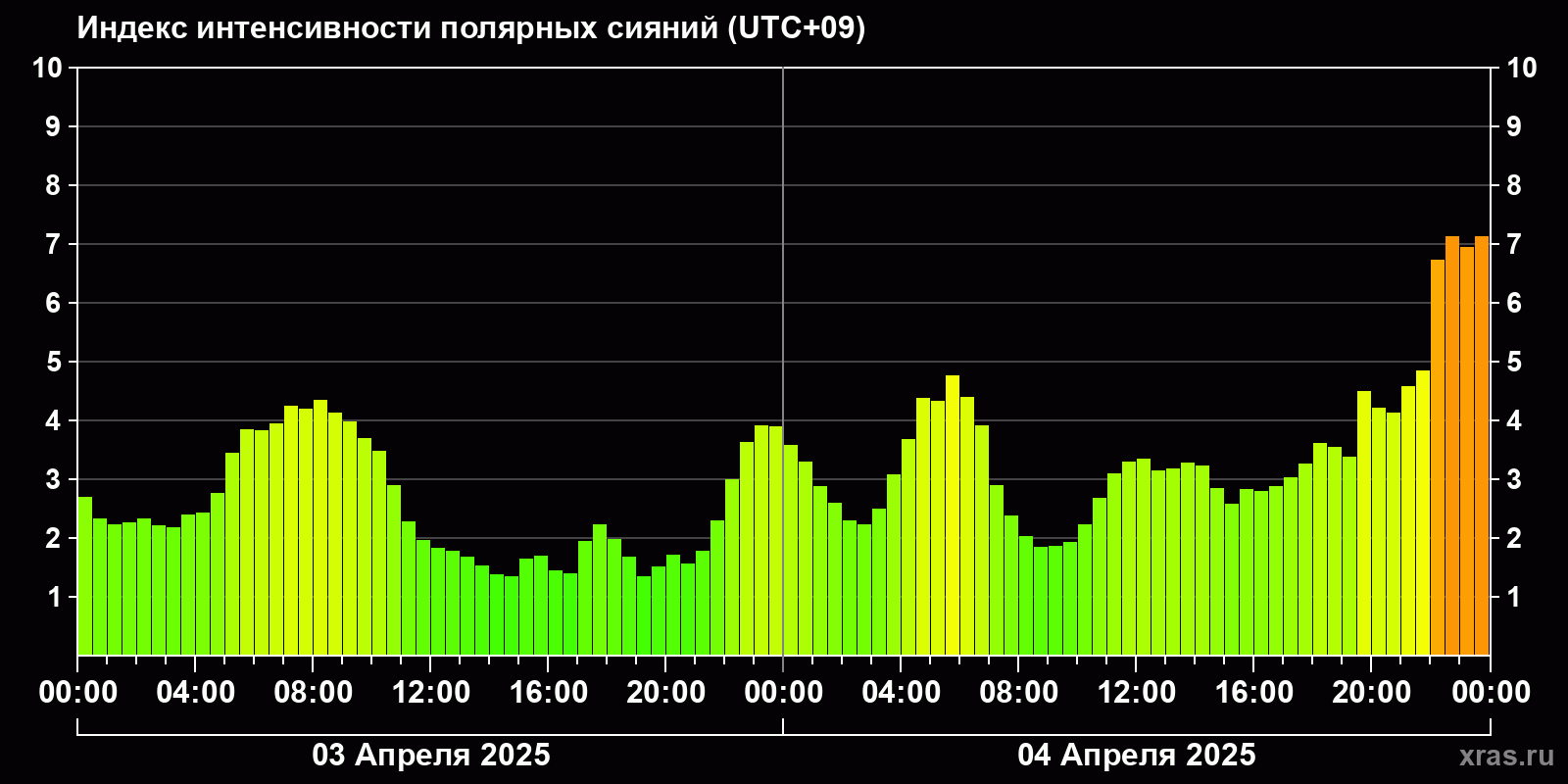 Изменения индекса интенсивности полярных сияний с 2025-04-03 по 2025-04-04 по местному времени