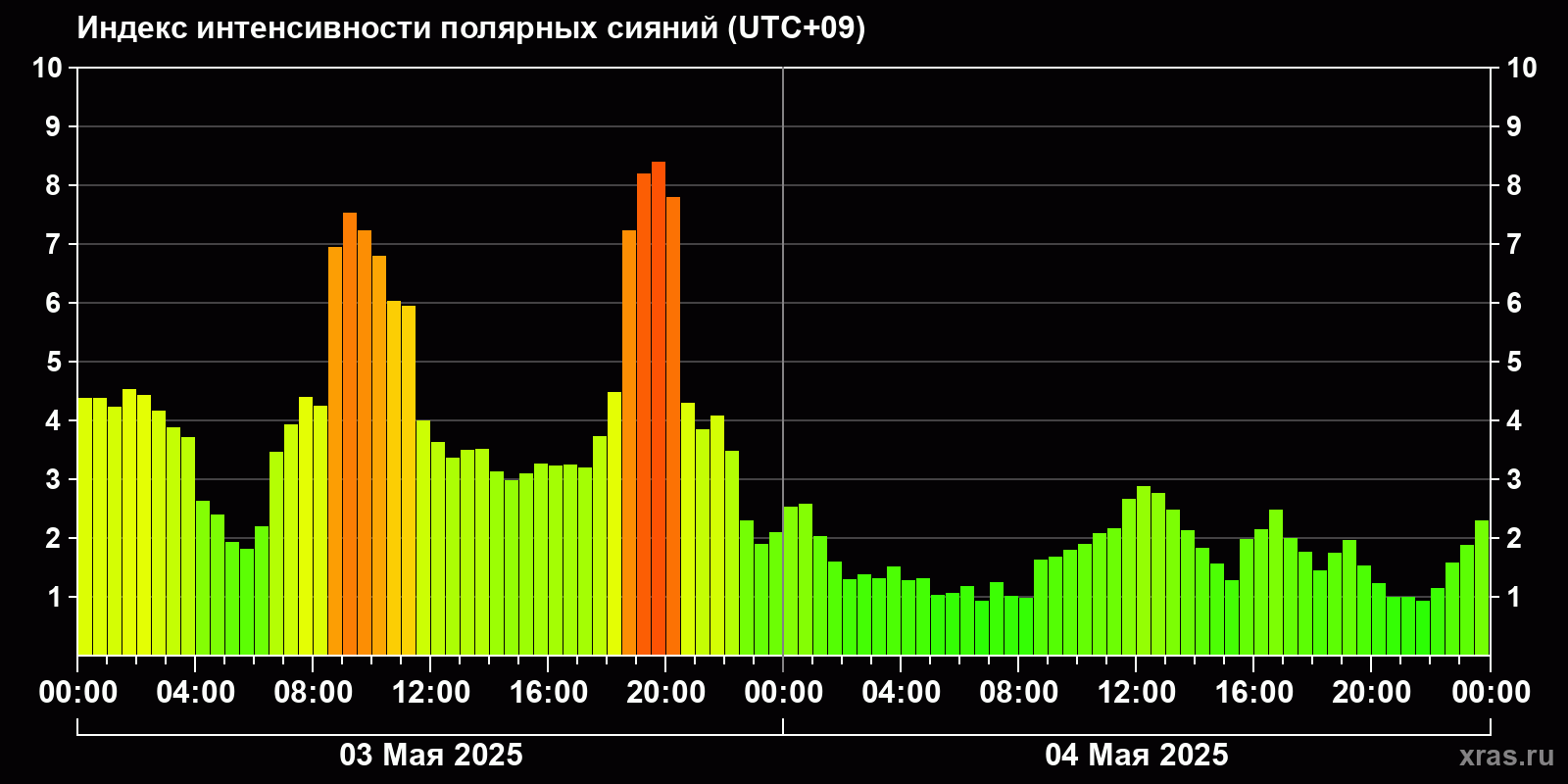 Изменения индекса интенсивности полярных сияний с 2025-05-03 по 2025-05-04 по местному времени