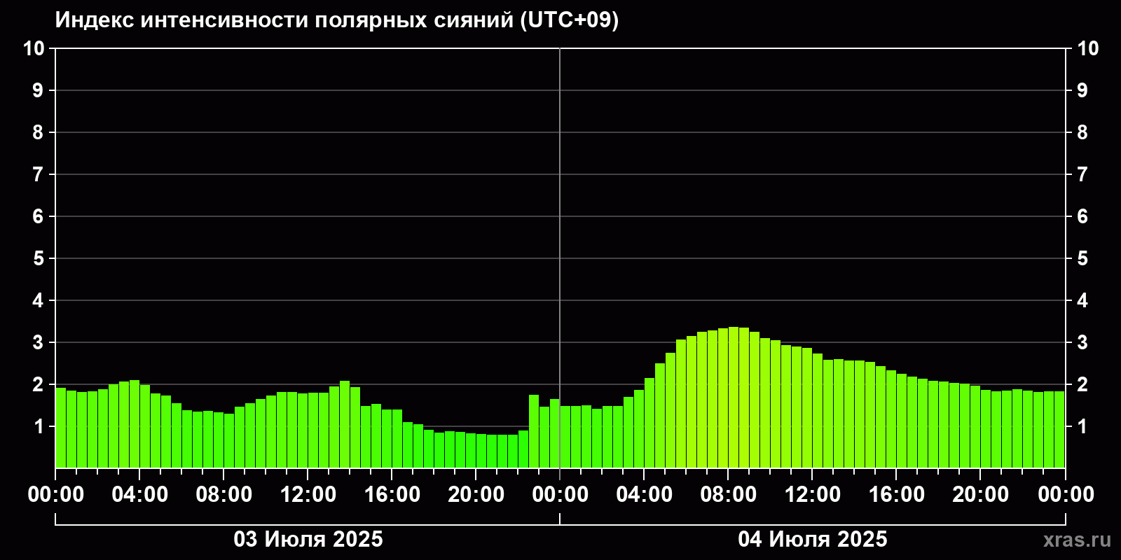 Изменения индекса интенсивности полярных сияний с 2025-07-03 по 2025-07-04 по местному времени