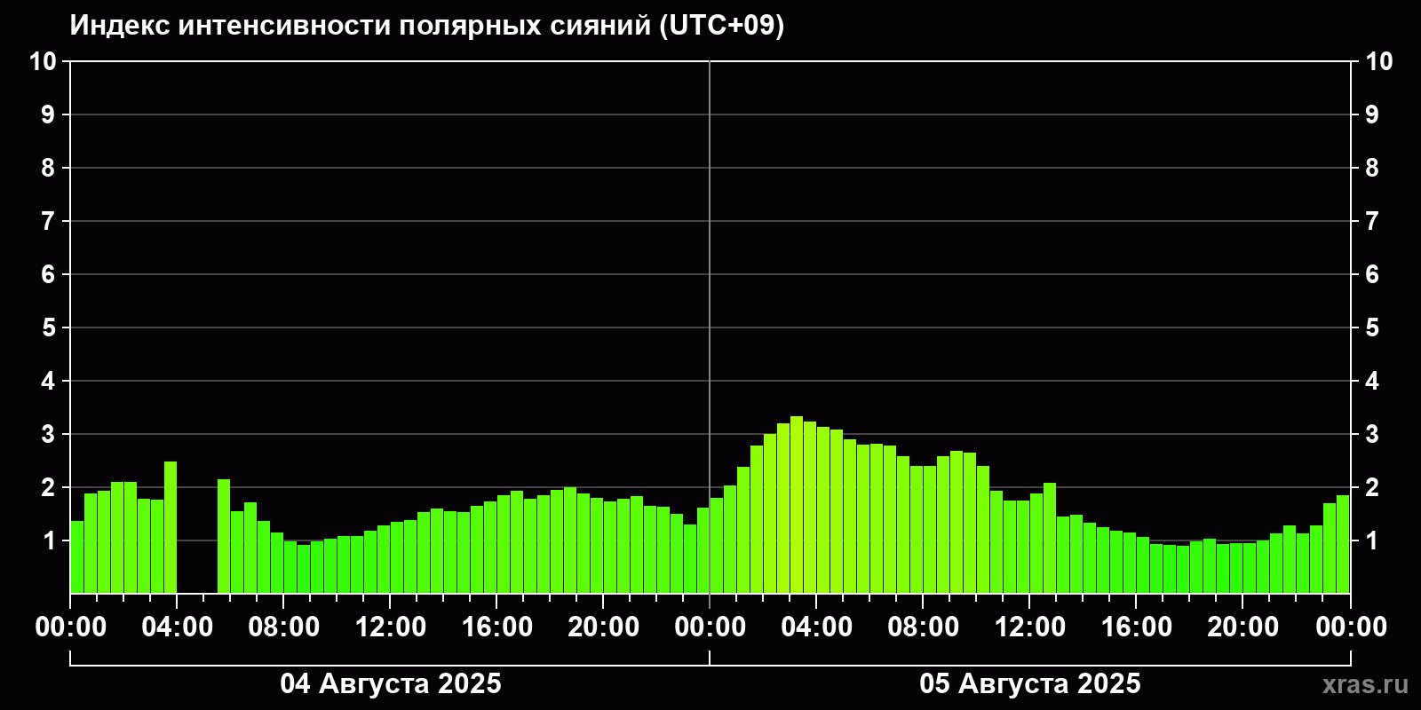 Изменения индекса интенсивности полярных сияний с 2025-08-04 по 2025-08-05 по местному времени