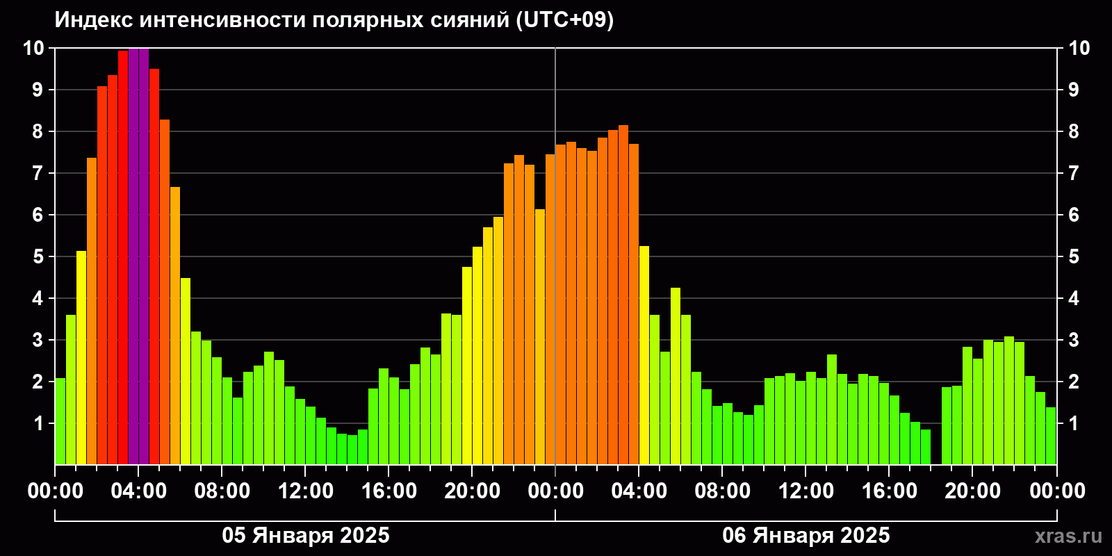 Изменения индекса интенсивности полярных сияний с 2025-01-05 по 2025-01-06 по местному времени