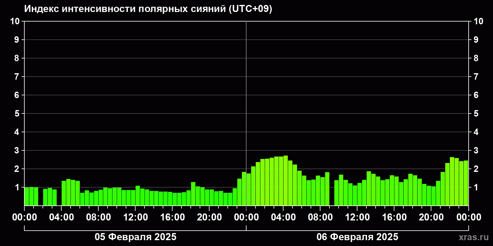 Изменения индекса интенсивности полярных сияний с 2025-02-05 по 2025-02-06 по местному времени