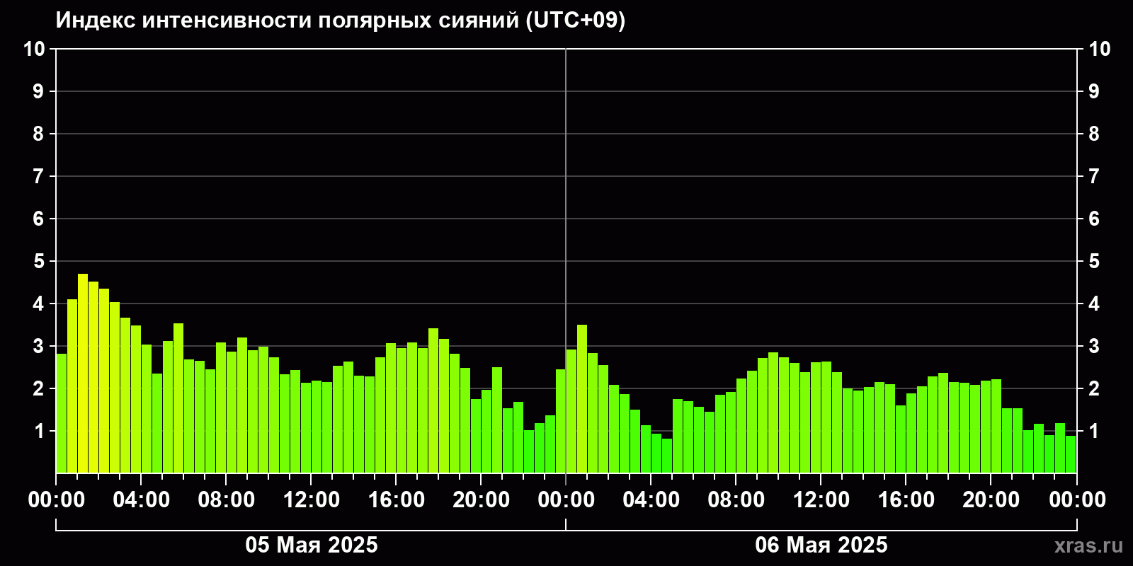 Изменения индекса интенсивности полярных сияний с 2025-05-05 по 2025-05-06 по местному времени