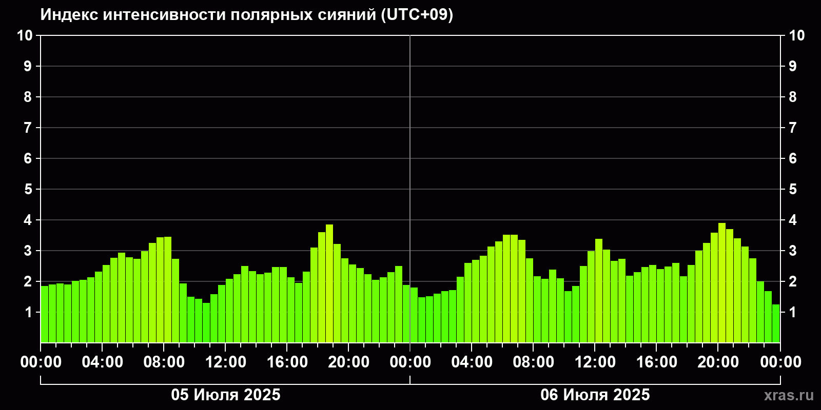 Изменения индекса интенсивности полярных сияний с 2025-07-05 по 2025-07-06 по местному времени
