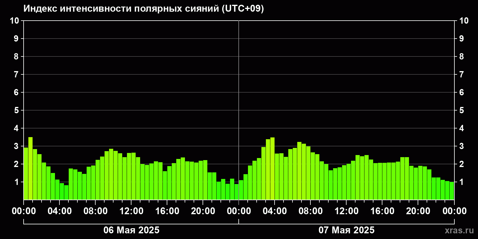Изменения индекса интенсивности полярных сияний с 2025-05-06 по 2025-05-07 по местному времени
