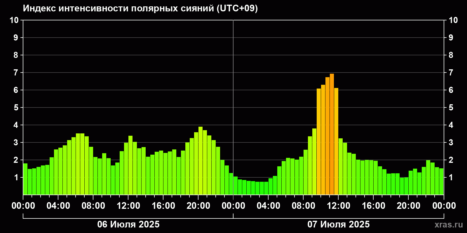 Изменения индекса интенсивности полярных сияний с 2025-07-06 по 2025-07-07 по местному времени