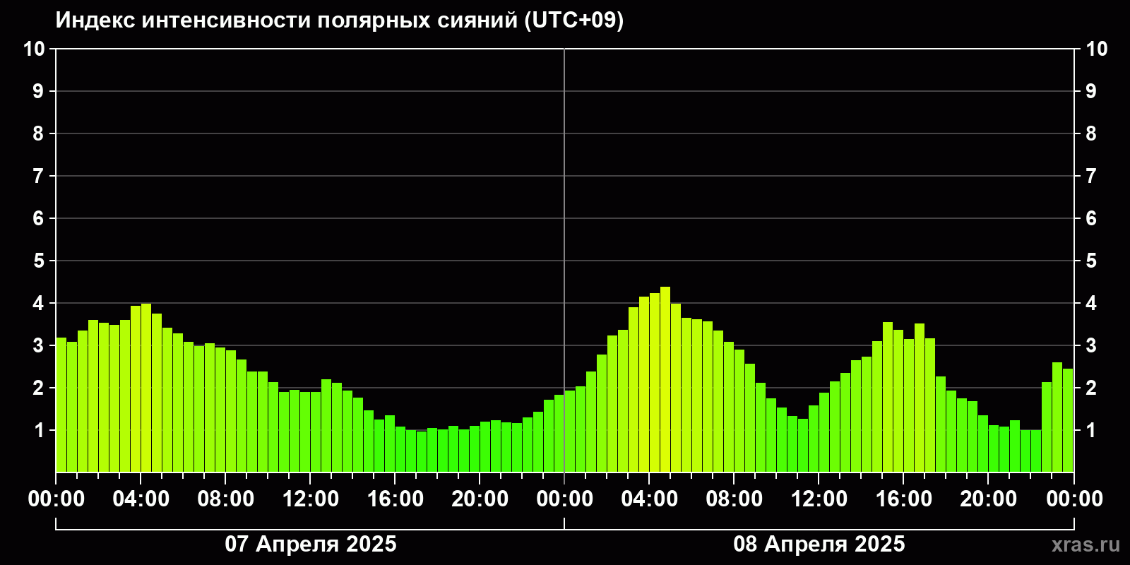 Изменения индекса интенсивности полярных сияний с 2025-04-07 по 2025-04-08 по местному времени