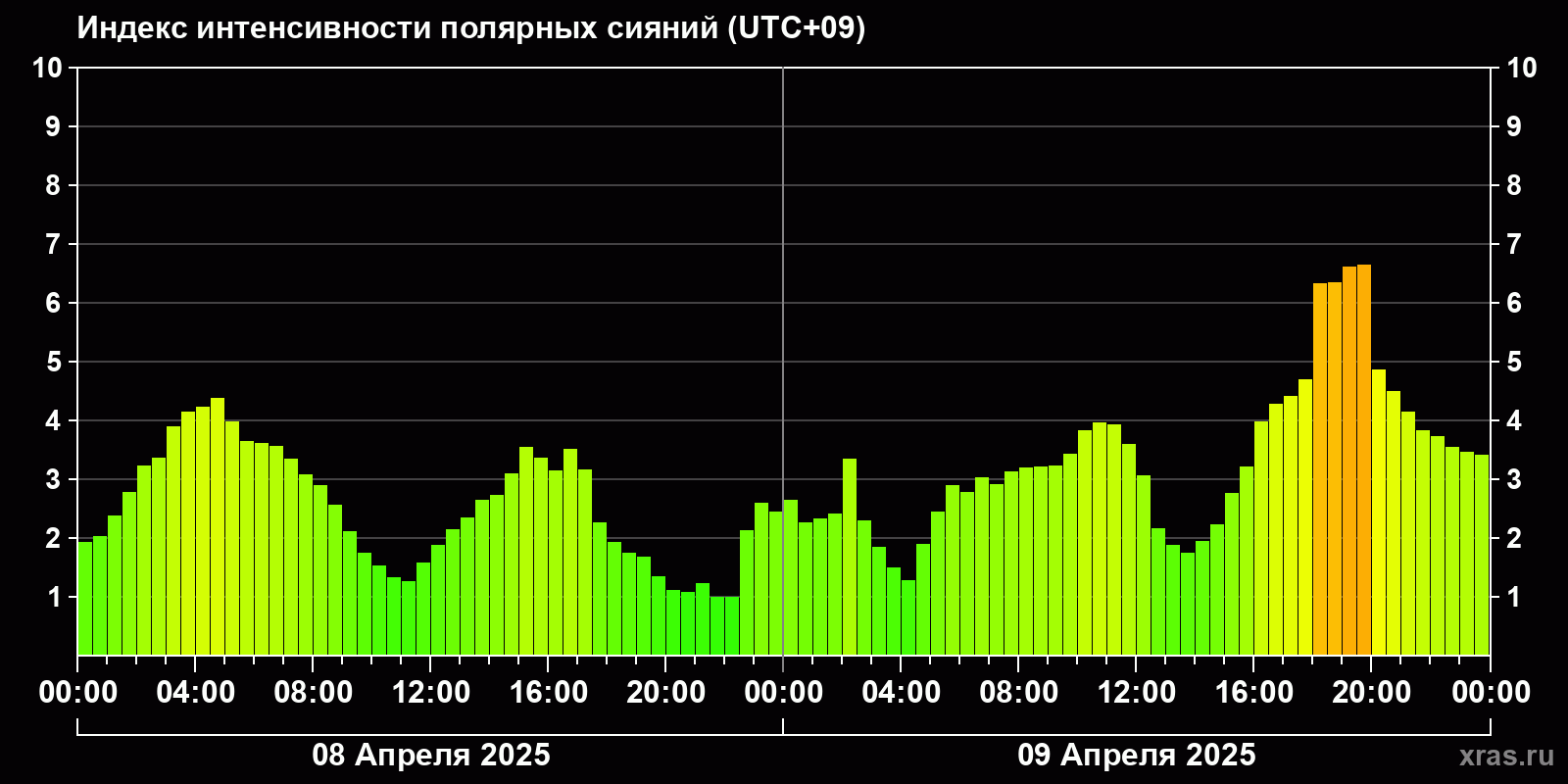 Изменения индекса интенсивности полярных сияний с 2025-04-08 по 2025-04-09 по местному времени