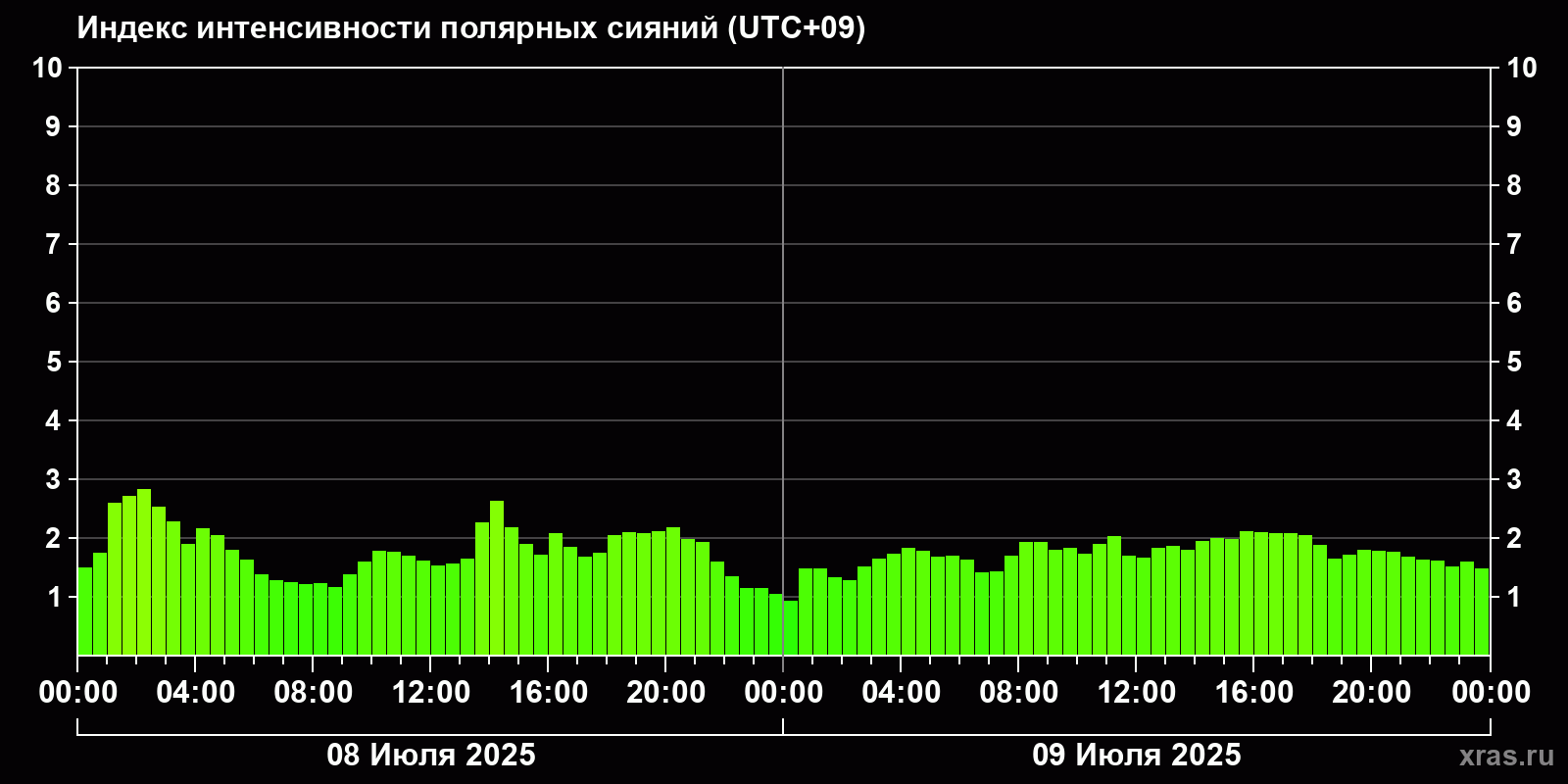 Изменения индекса интенсивности полярных сияний с 2025-07-08 по 2025-07-09 по местному времени