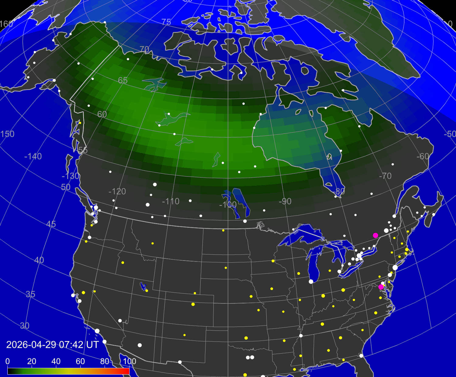 Вероятность полярных сияний в городах США