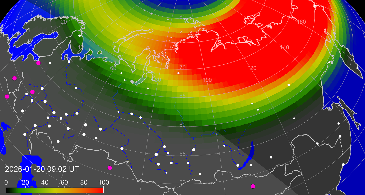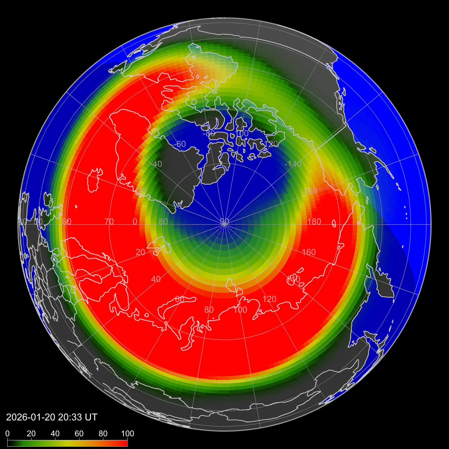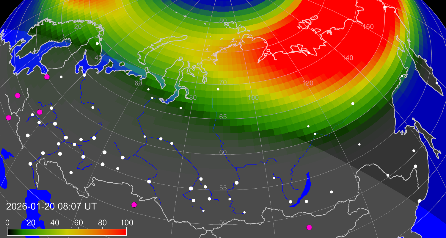 Изменения и часовой прогноз индекса интенсивности полярных сияний с 2026-01-20 по 2026-01-21