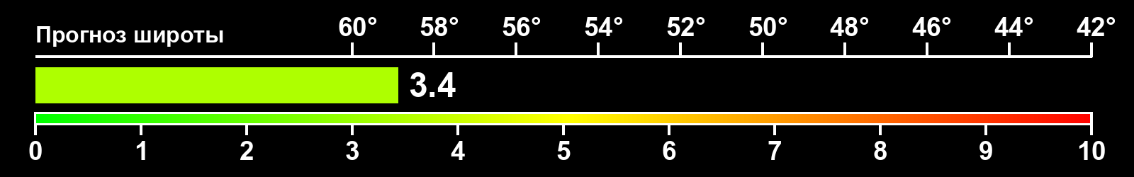 Индекс интенсивности полярных сияний и теоретически возможная широта наблюдений для ночного времени в западном полушарии по состоянию на 2026-04-18 23:56 (конец дня) по местному времени