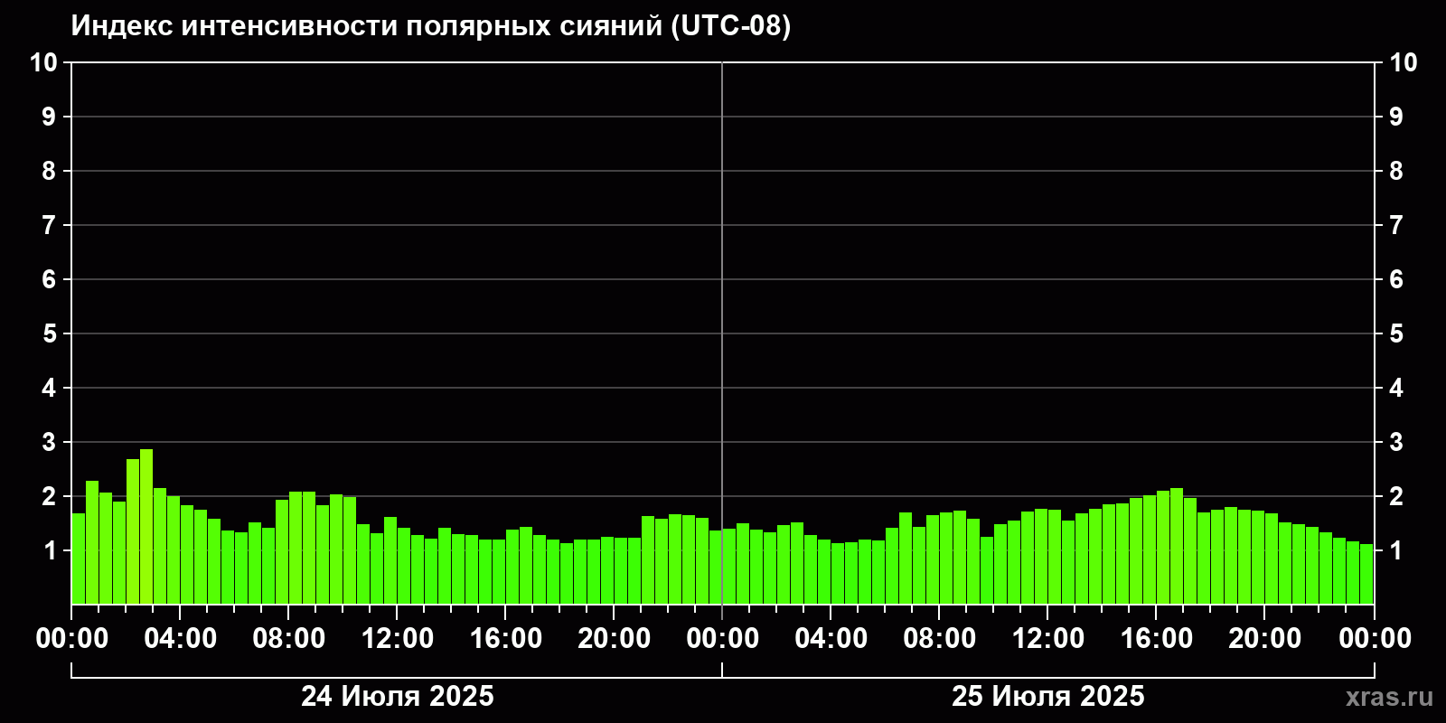 Изменения индекса интенсивности полярных сияний с 2025-07-24 по 2025-07-25 по местному времени
