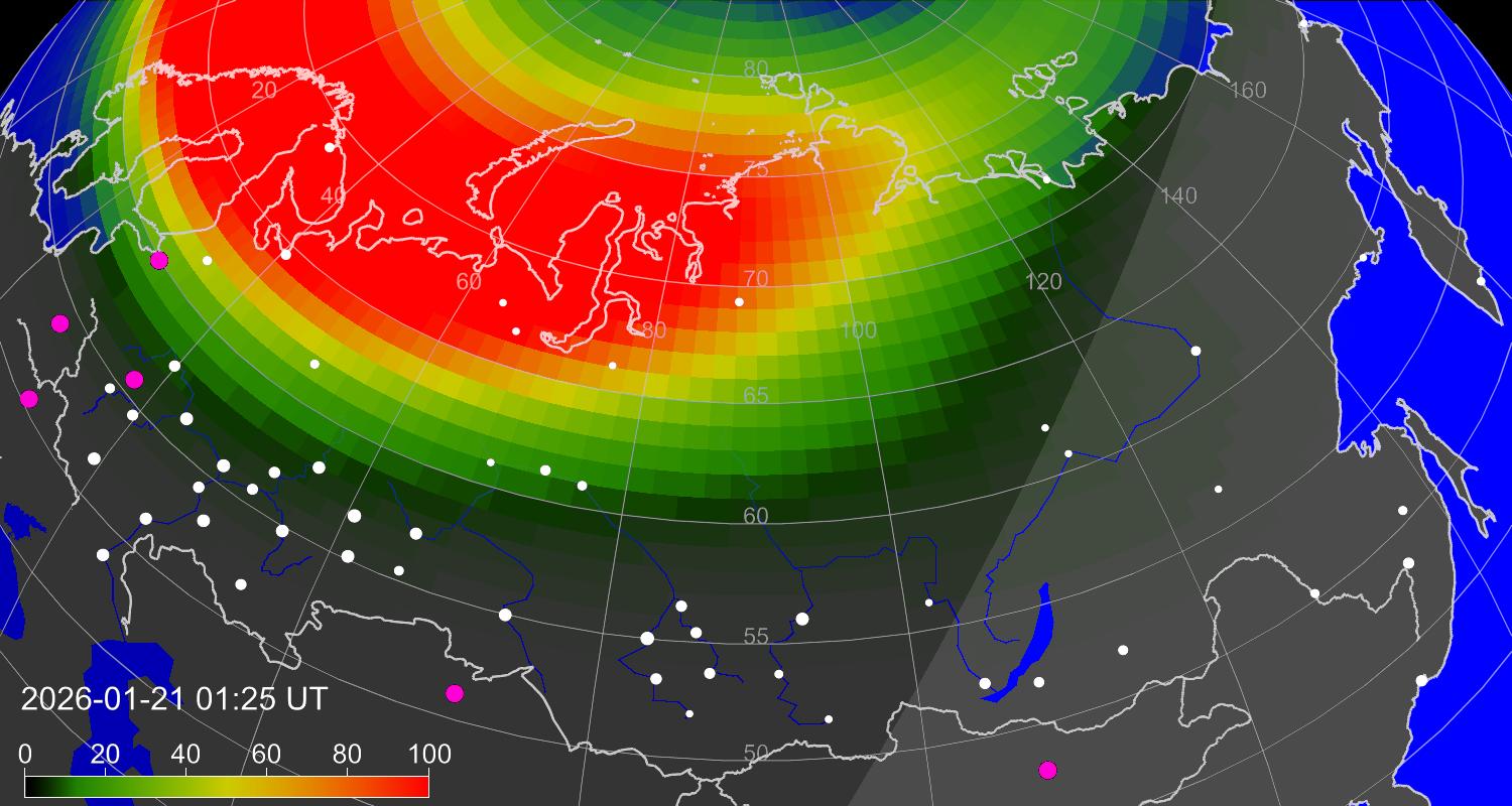 Изменения и часовой прогноз индекса интенсивности полярных сияний с 2026-01-20 по 2026-01-21