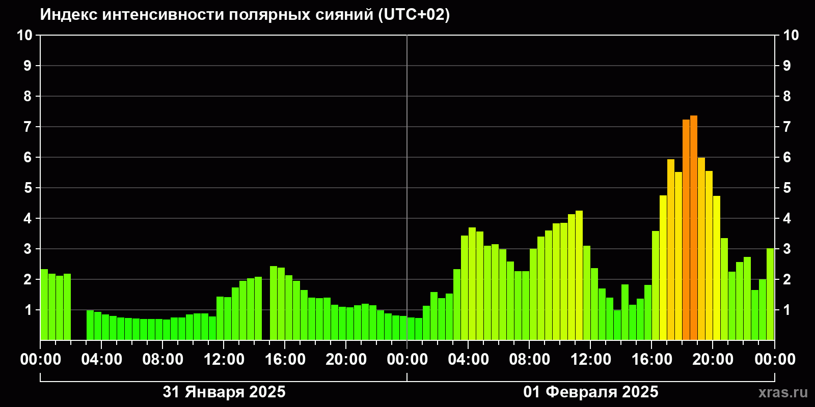 Изменения индекса интенсивности полярных сияний с 2025-01-31 по 2025-02-01 по местному времени