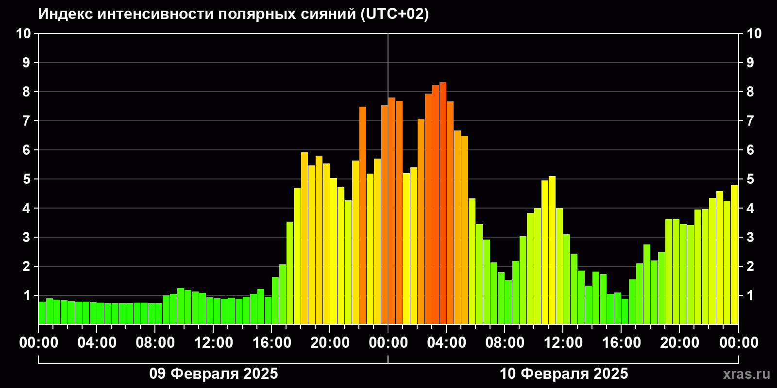 Изменения индекса интенсивности полярных сияний с 2025-02-09 по 2025-02-10 по местному времени