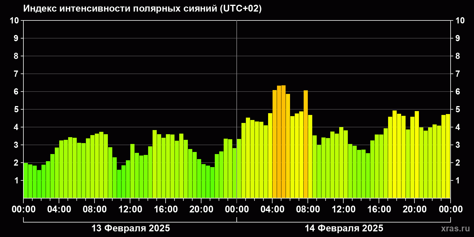 Изменения индекса интенсивности полярных сияний с 2025-02-13 по 2025-02-14 по местному времени