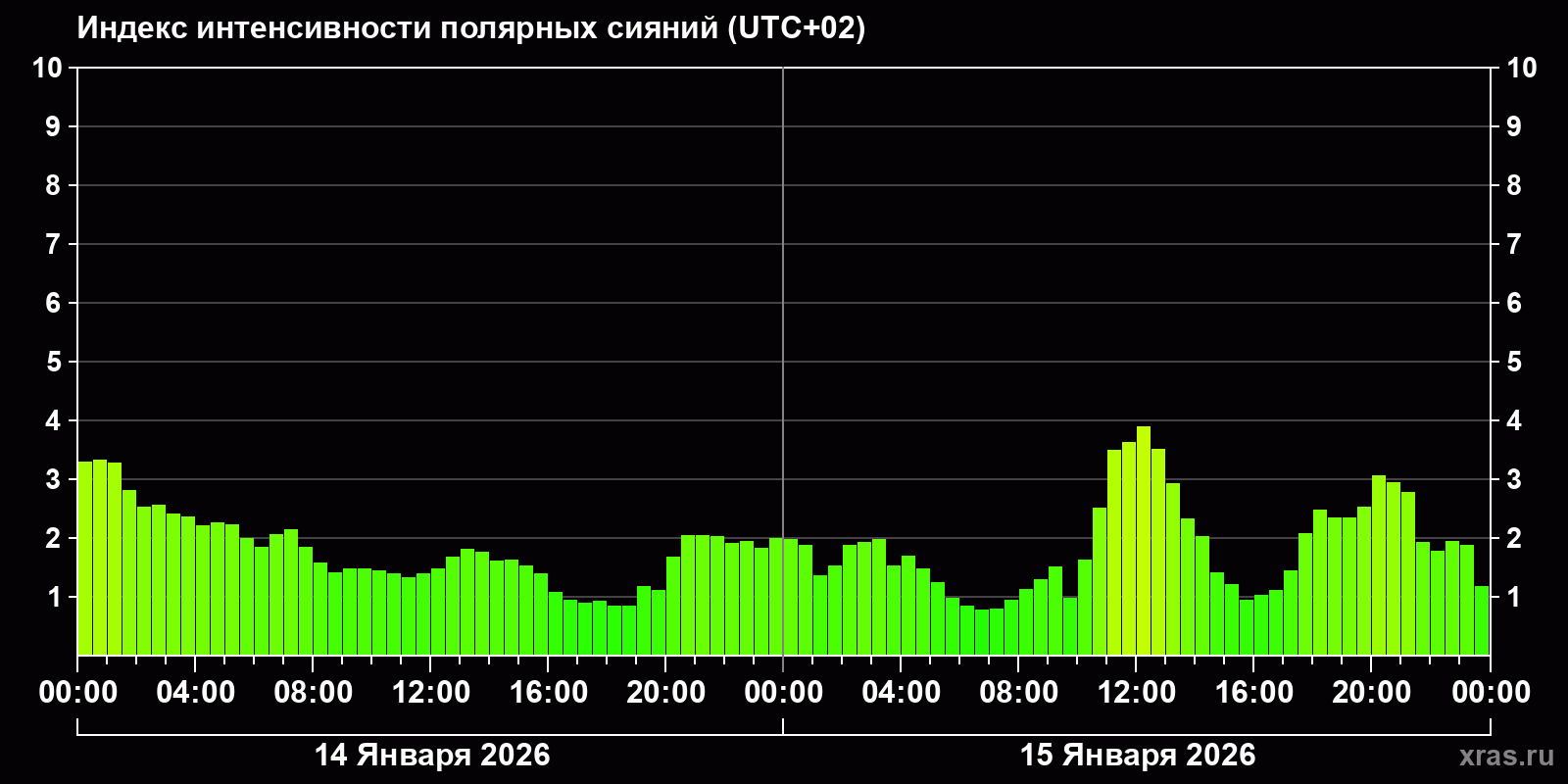 Изменения индекса интенсивности полярных сияний с 2026-01-14 по 2026-01-15 по местному времени