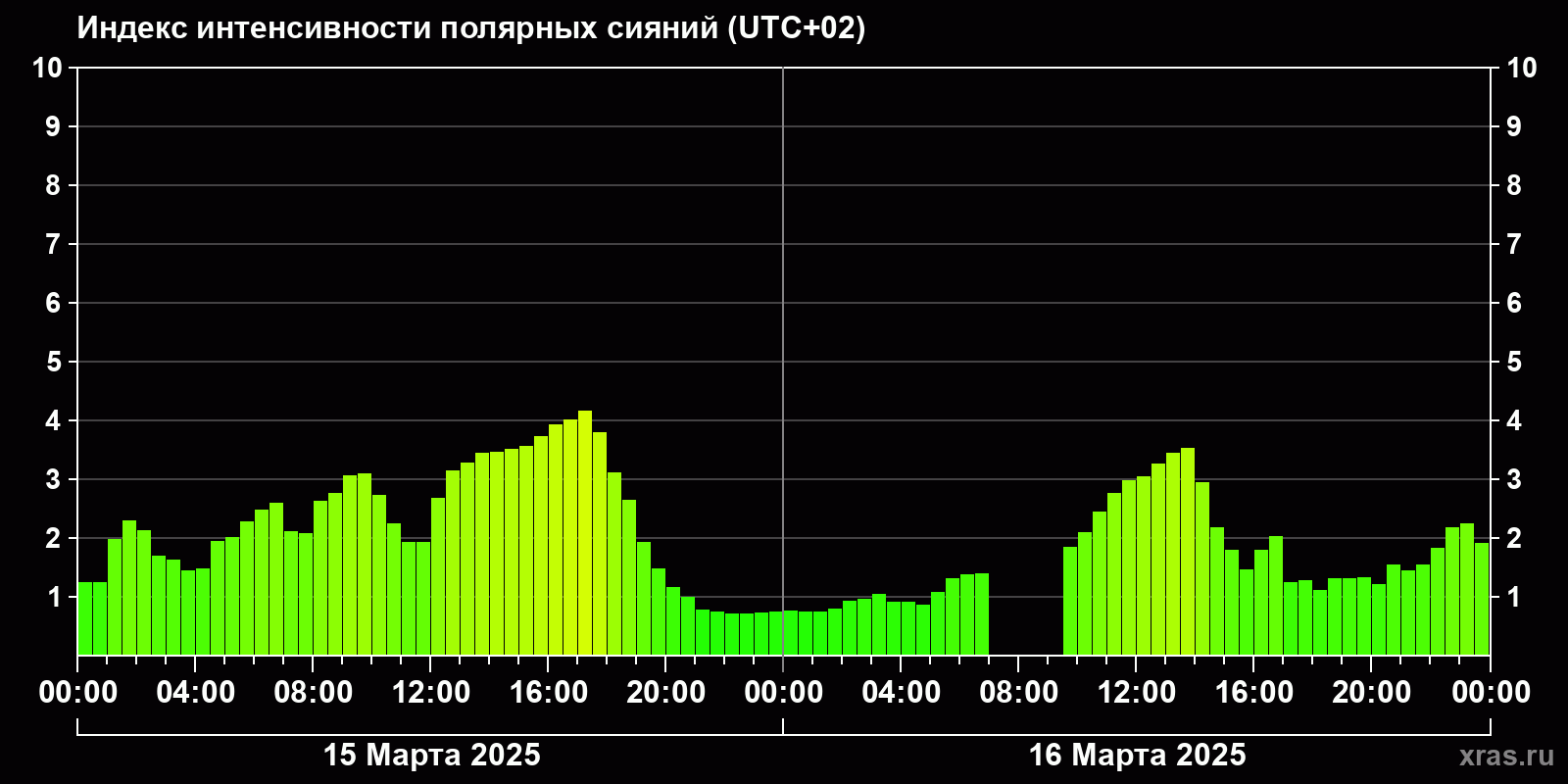Изменения индекса интенсивности полярных сияний с 2025-03-15 по 2025-03-16 по местному времени