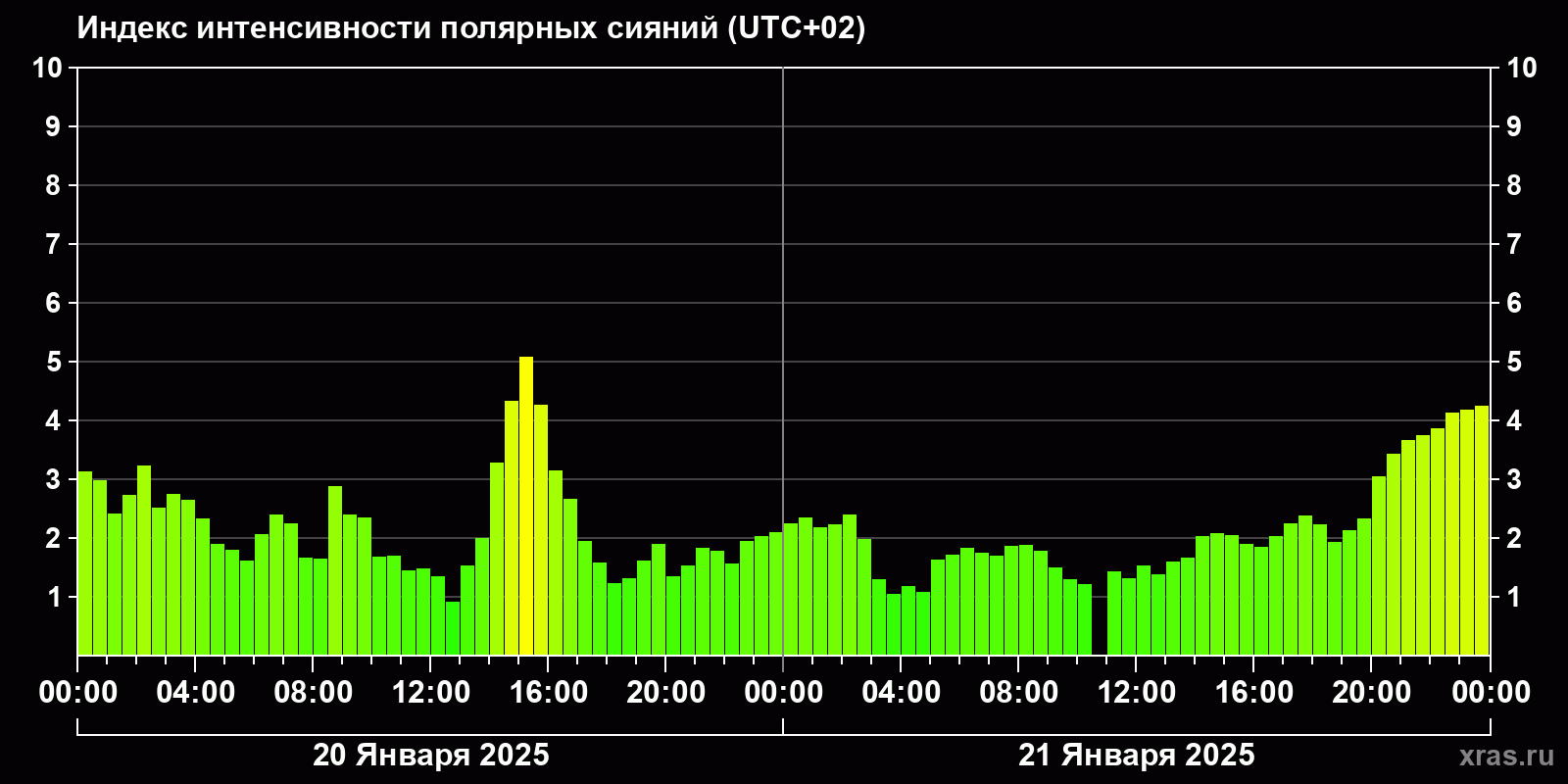 Изменения индекса интенсивности полярных сияний с 2025-01-20 по 2025-01-21 по местному времени