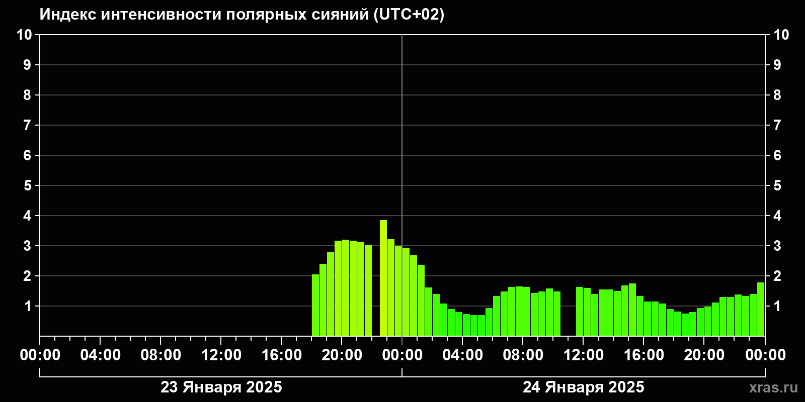 Изменения индекса интенсивности полярных сияний с 2025-01-23 по 2025-01-24 по местному времени