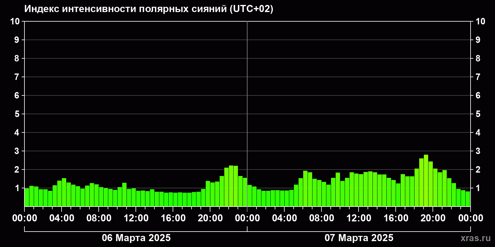 Изменения индекса интенсивности полярных сияний с 2025-03-06 по 2025-03-07 по местному времени