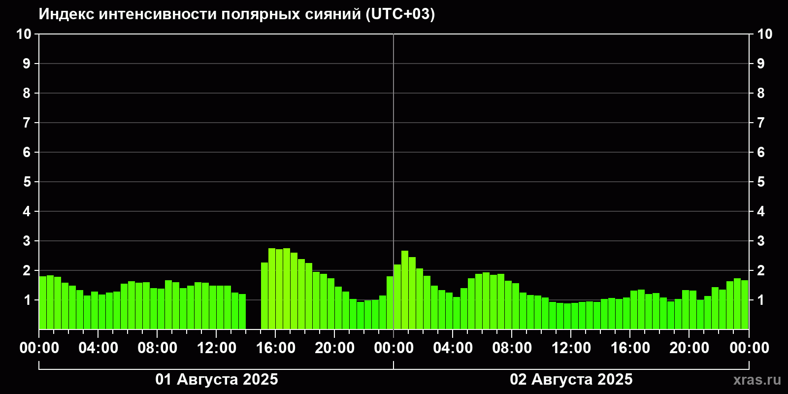 Изменения индекса интенсивности полярных сияний с 2025-08-01 по 2025-08-02 по местному времени