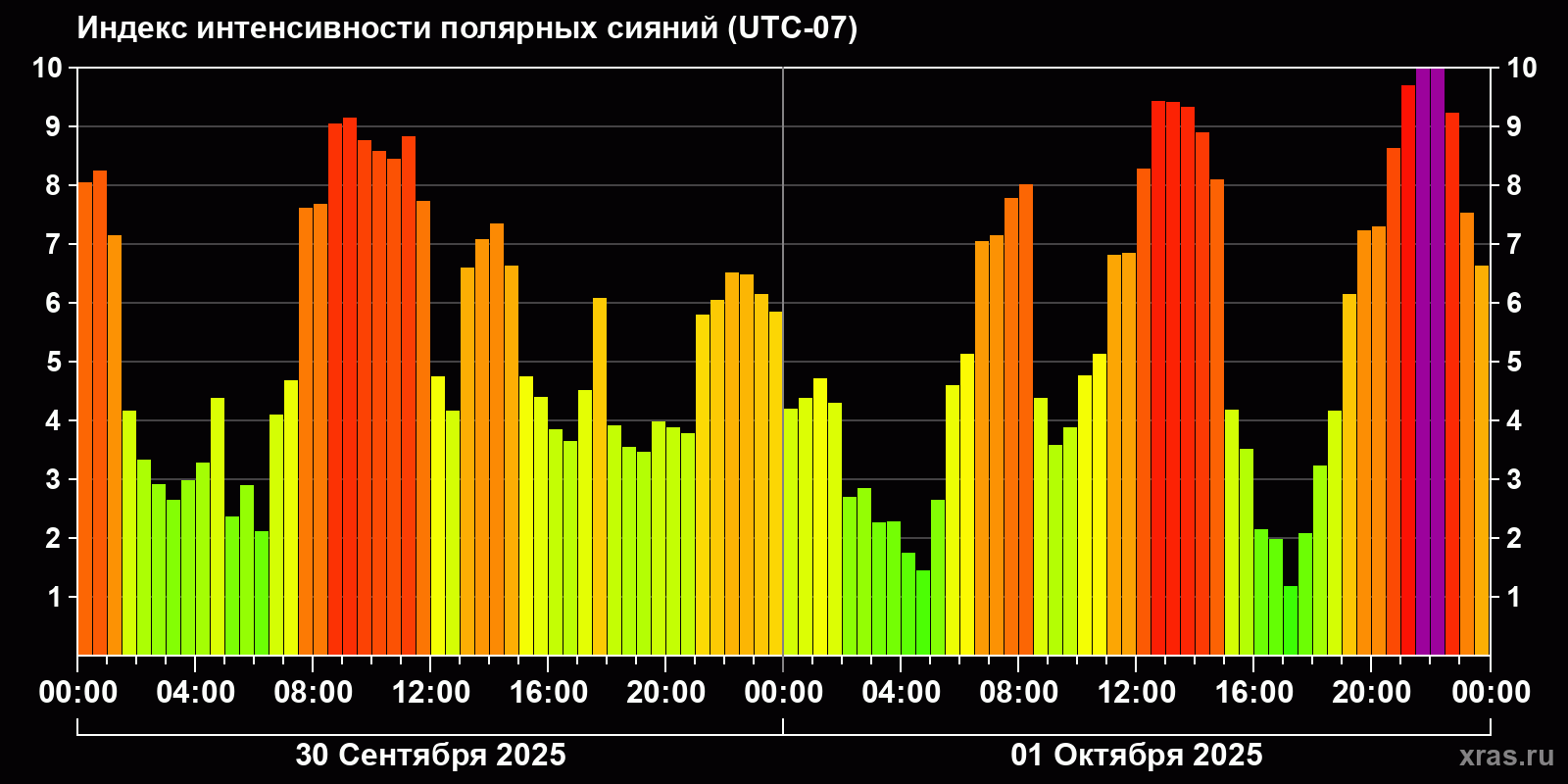 Изменения индекса интенсивности полярных сияний с 2025-09-30 по 2025-10-01 по местному времени