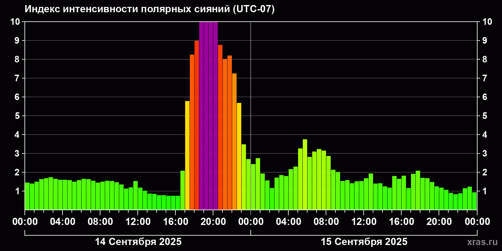 Изменения индекса интенсивности полярных сияний с 2025-09-14 по 2025-09-15 по местному времени