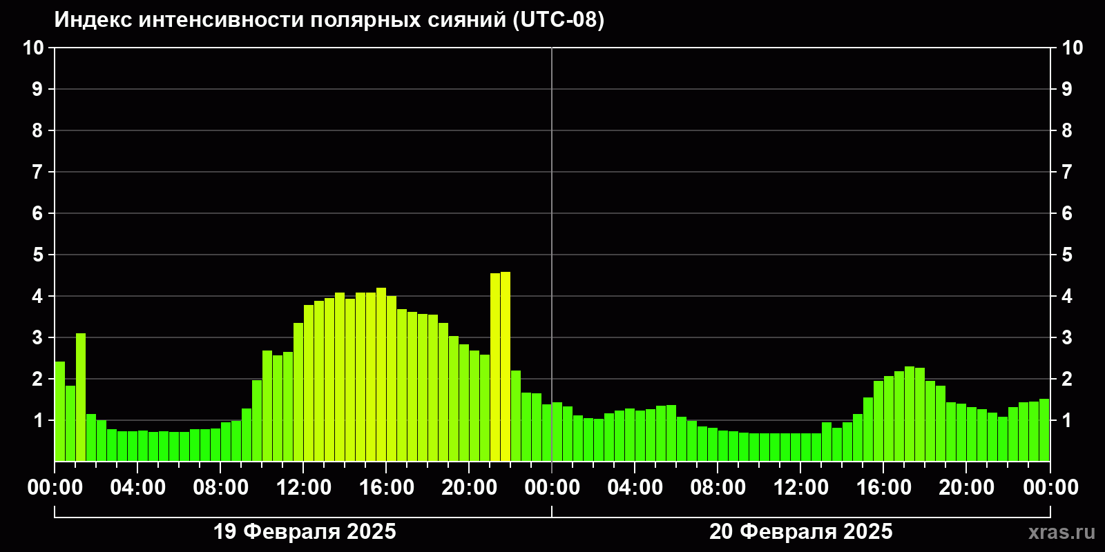 Изменения индекса интенсивности полярных сияний с 2025-02-19 по 2025-02-20 по местному времени