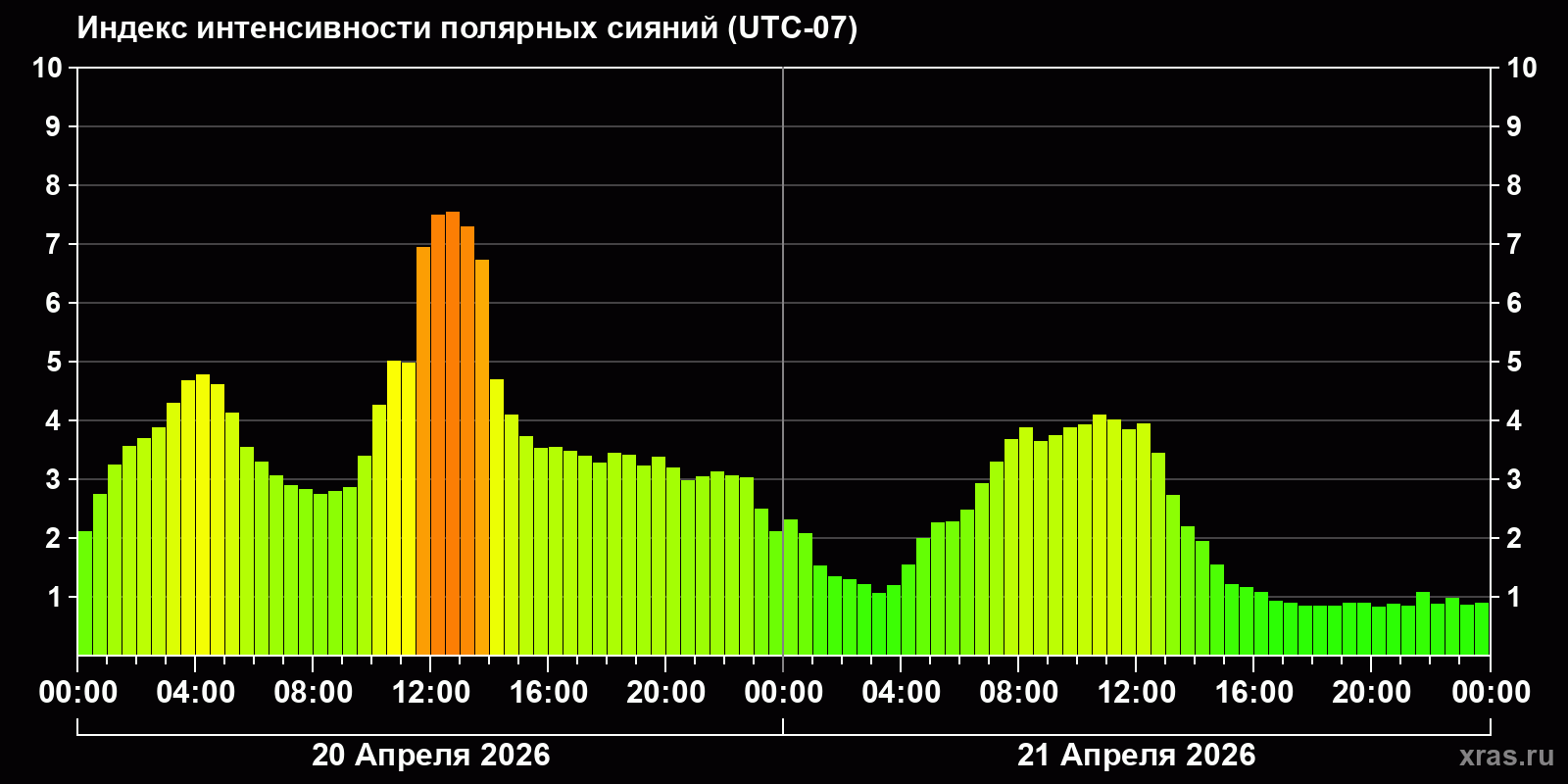 Изменения индекса интенсивности полярных сияний с 2026-04-20 по 2026-04-21 по местному времени