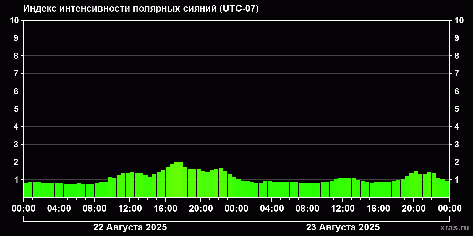 Изменения индекса интенсивности полярных сияний с 2025-08-22 по 2025-08-23 по местному времени