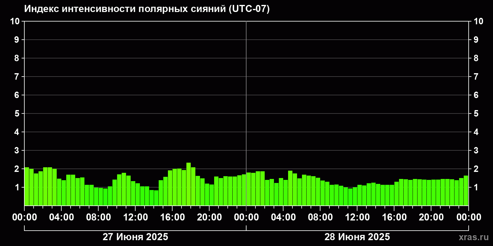 Изменения индекса интенсивности полярных сияний с 2025-06-27 по 2025-06-28 по местному времени