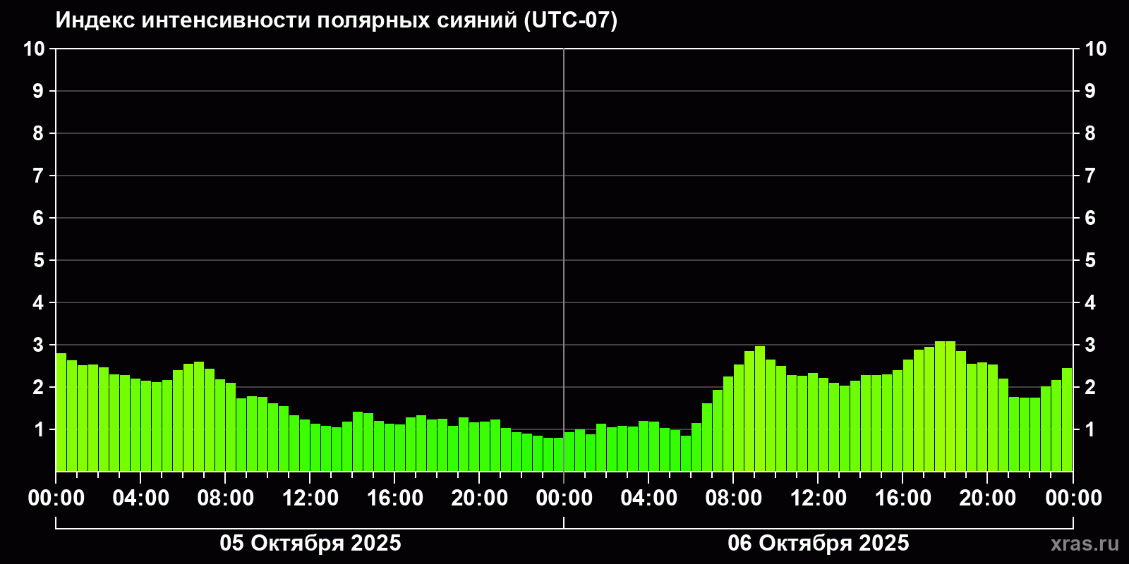 Изменения индекса интенсивности полярных сияний с 2025-10-05 по 2025-10-06 по местному времени