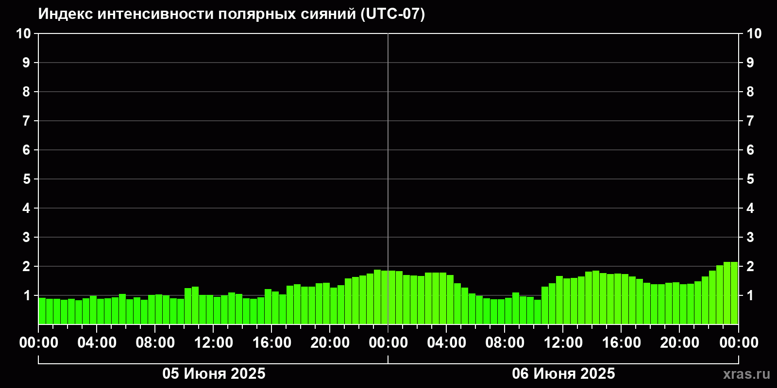 Изменения индекса интенсивности полярных сияний с 2025-06-05 по 2025-06-06 по местному времени